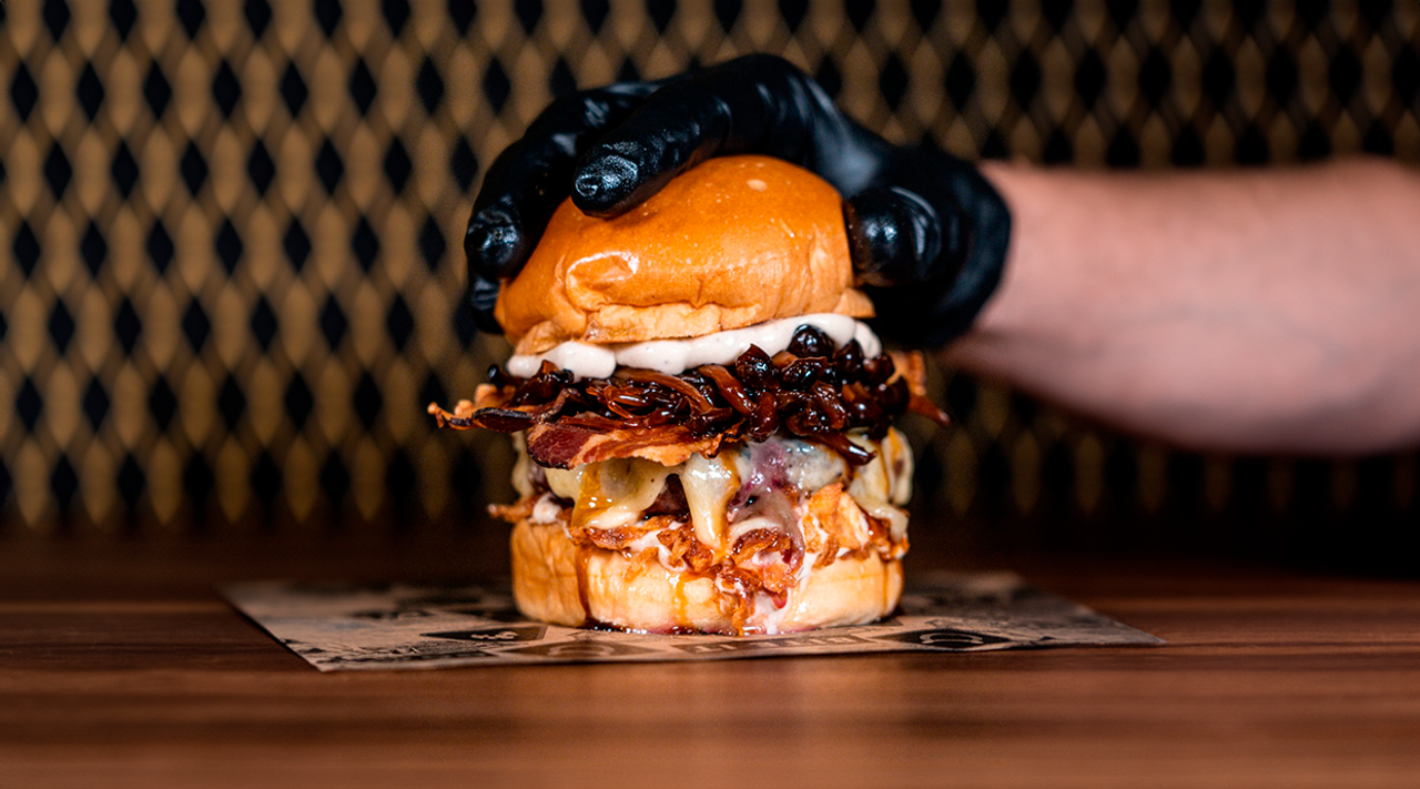 Pan brioche, 180gr Black Angus o Dry Aged (+3€) cocinada en horno de carbón Josper, queso cheddar americano, cebolla morada, pulled pork cocinado a baja temperatura y salsa Bourbon.