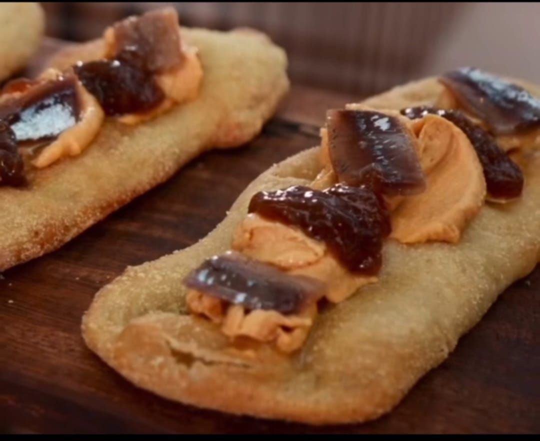 Hummus de pimiento, sardina ahumada y mermelada de tomate