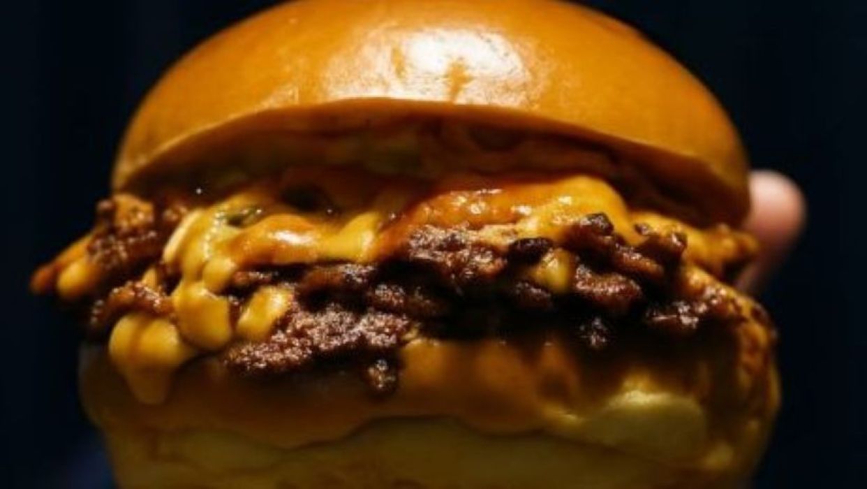 pan brioche vegan, dos discos de beyond meat, queso cheddar y mayonesa vegana, lechuga, pepinillo y salsa manzo