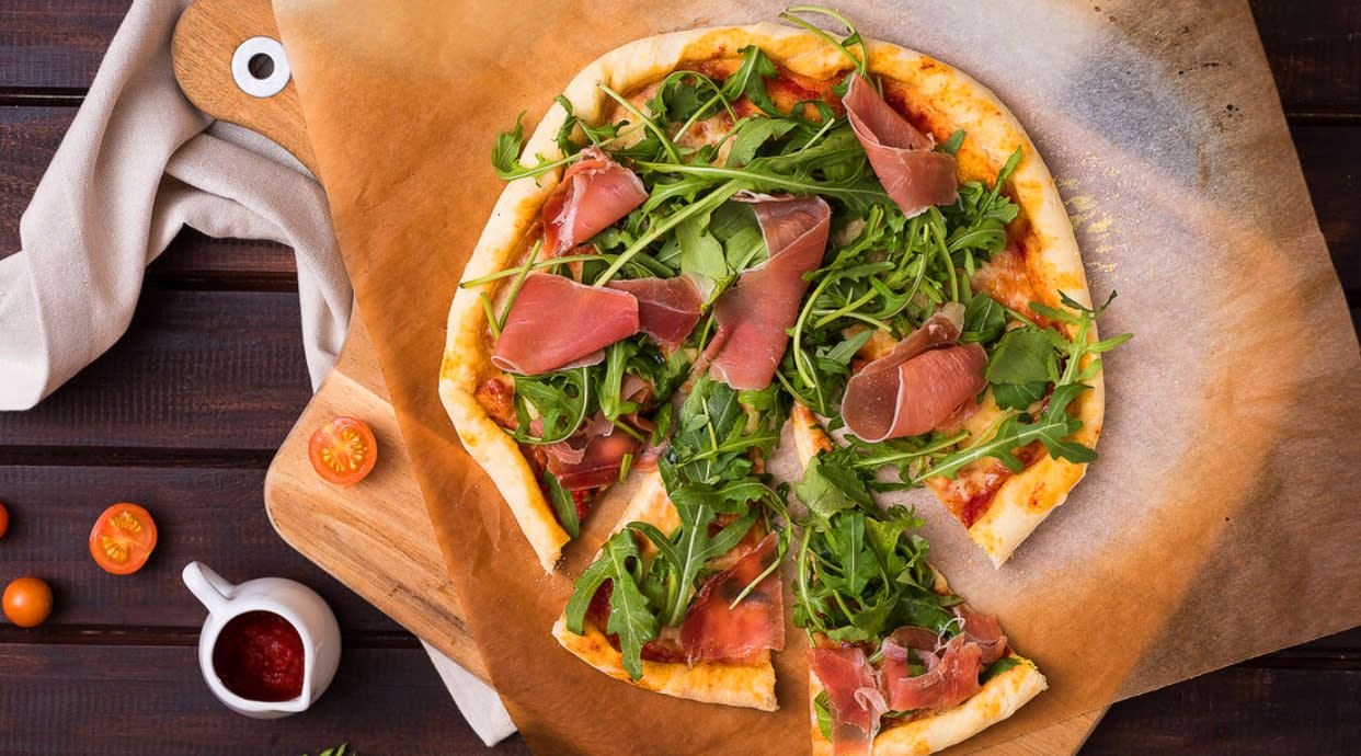 Jamón serrano, rúcula, tomate cherry, mozzarella de búfala, ajo, aceitunas negras y granna padano