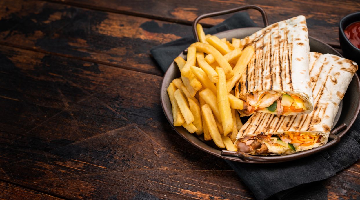 Rollo de durum relleno con carne a elegir (pollo o ternera), verduras frescas, queso fundido gratinado, salsa especial, patatas fritas y bebida a elegir