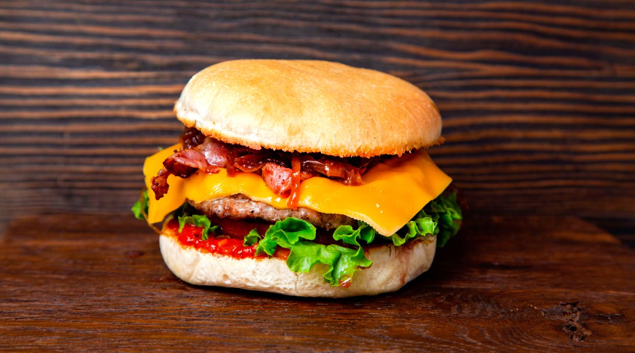 2 Hamburguesas, lechuga, cebolla, tomate, queso, kétchup y mayonesa