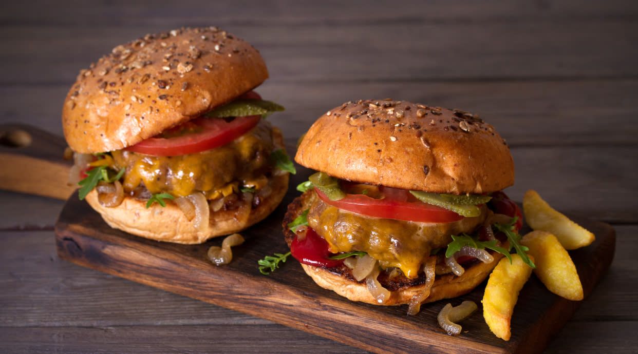 Medallón de carne de ternera, queso provoleta, queso cheddar confitado, rúcula y bacon, acompañada de patatas fritas