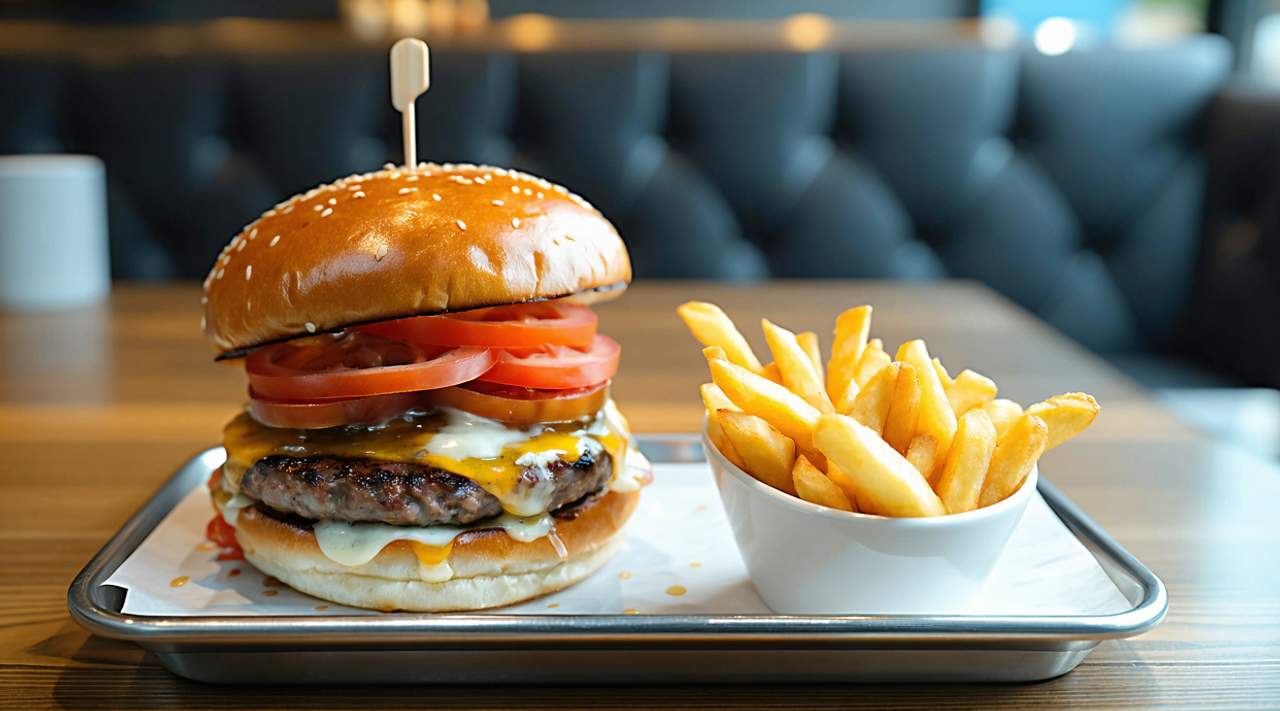 Pan de hamburguesa, 2 hamburguesas de carne, queso americano, cebolla encurtida, mayonesa de trufa y cebolla crujiente