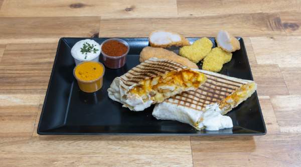 Relleno con pollo crujiente, lechuga, tomate, salsa de queso y salsa a elegir.