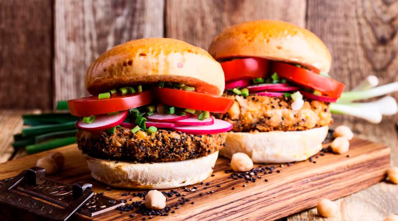 Pan esponjoso artesanal con semillas de sésamo, hamburguesa autentica vegana con sabor 100 % a carne, rulo de cabra vegano, lechuga, tomate, cebolla y mayonesa vegano con patatas fritas o arroz