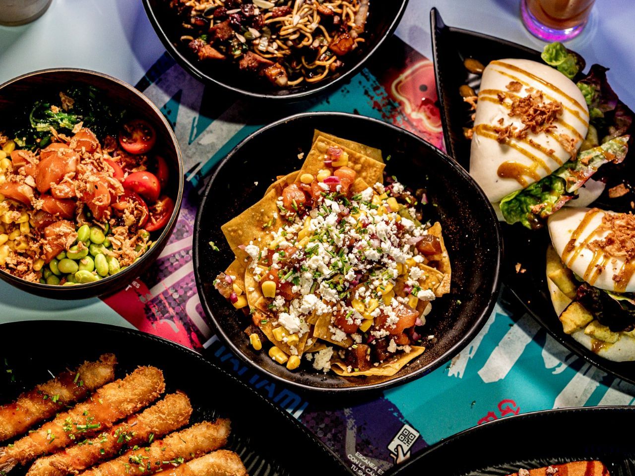 Nachos con salmón, atún, maíz, queso feta, cebolla roja, cebollino, guacamole, jalapeños y soja