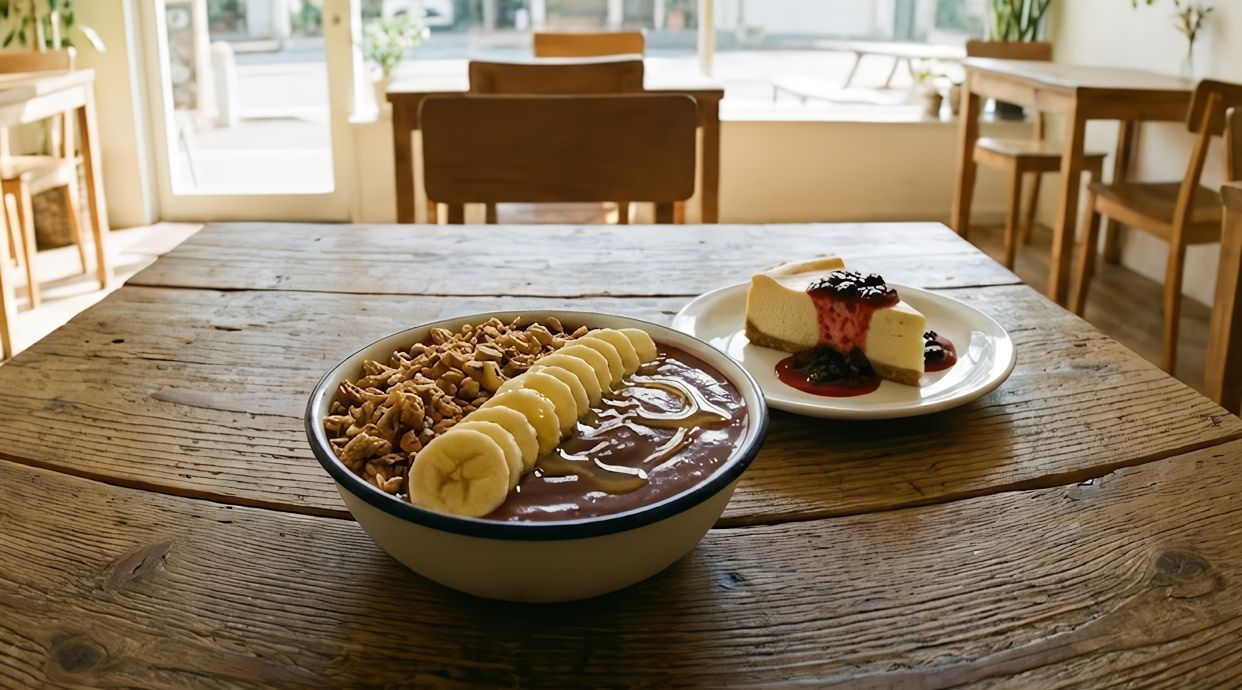 Açaí orgánico, guaraná, plátano, granola casera, muesli de chocolate, dulce de leche y coco rallado