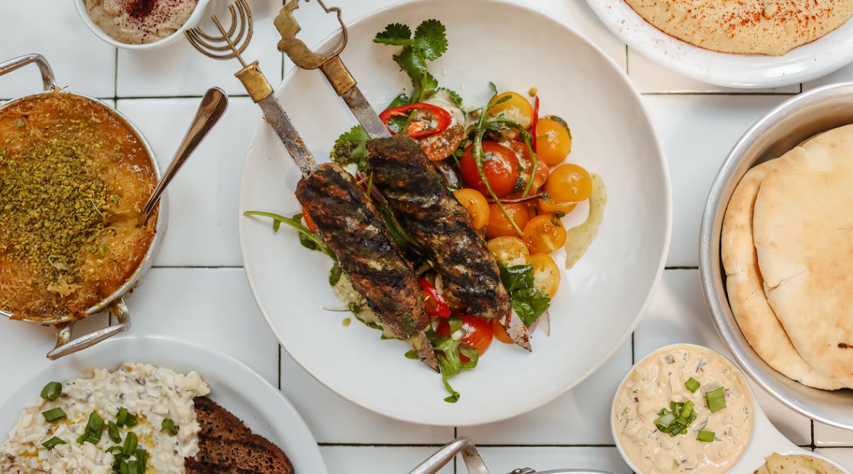 Salsa de tomate, queso, carne de shawarma y cebolla