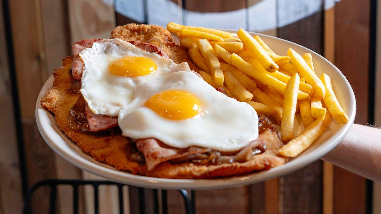 Milanesa de ternera, lechuga, tomate, queso cheddar, bacon, huevo, mayonesa y mostaza