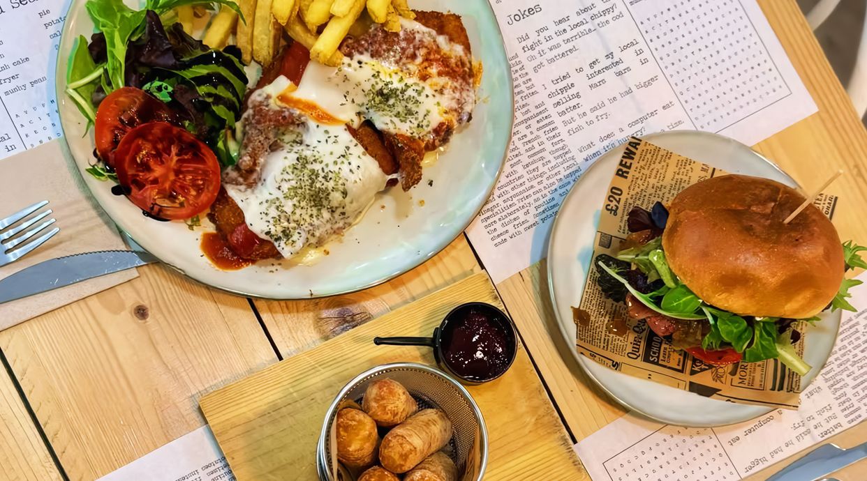 Pollo rebozado, tomate frito, queso gouda y orégano