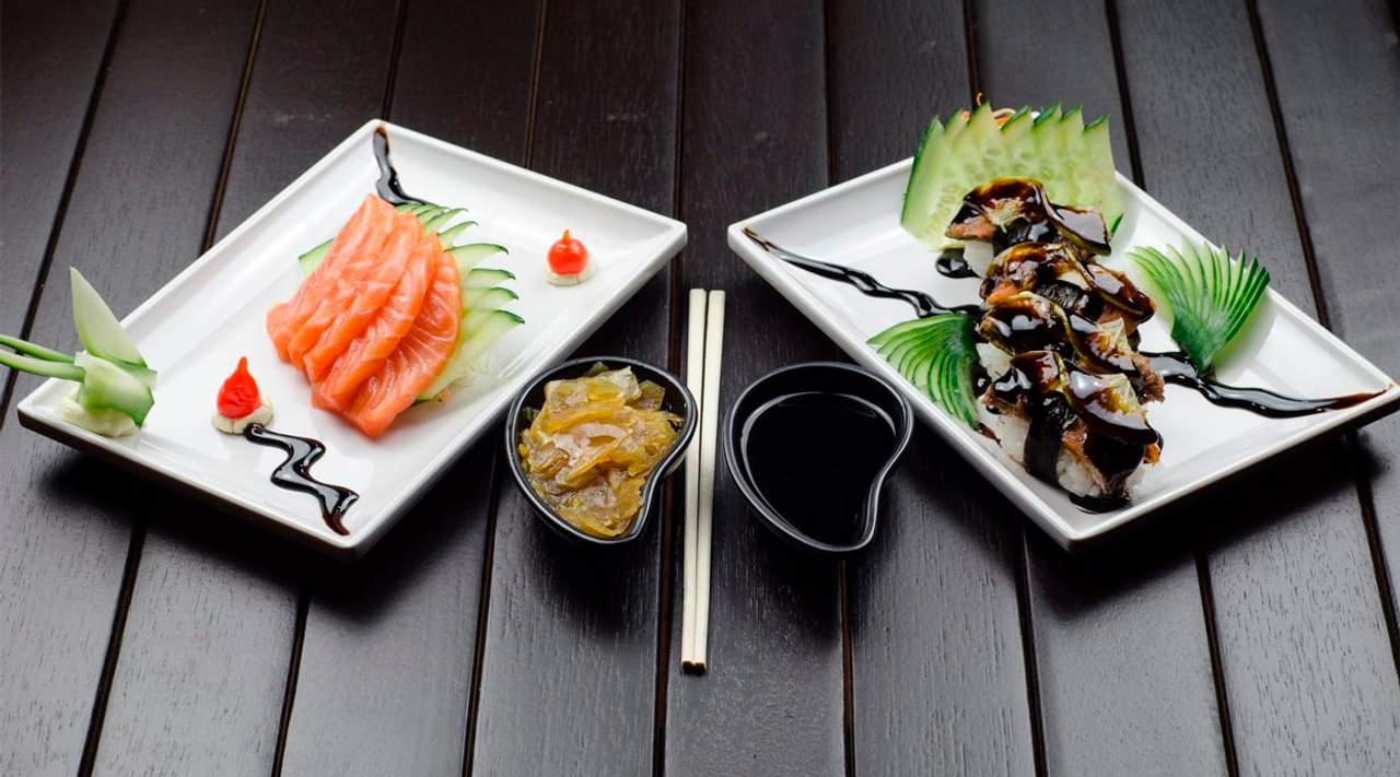 Maki masago (4 uds.), California con cebolla frita (4 uds.), maki flameado con gambas y aguacate (4 uds,), maki de aguacate (4 uds.), maki de salmón (4 uds.), nigiri de salmón (2 uds.) y nigiri flameado de salmón (2 uds.)