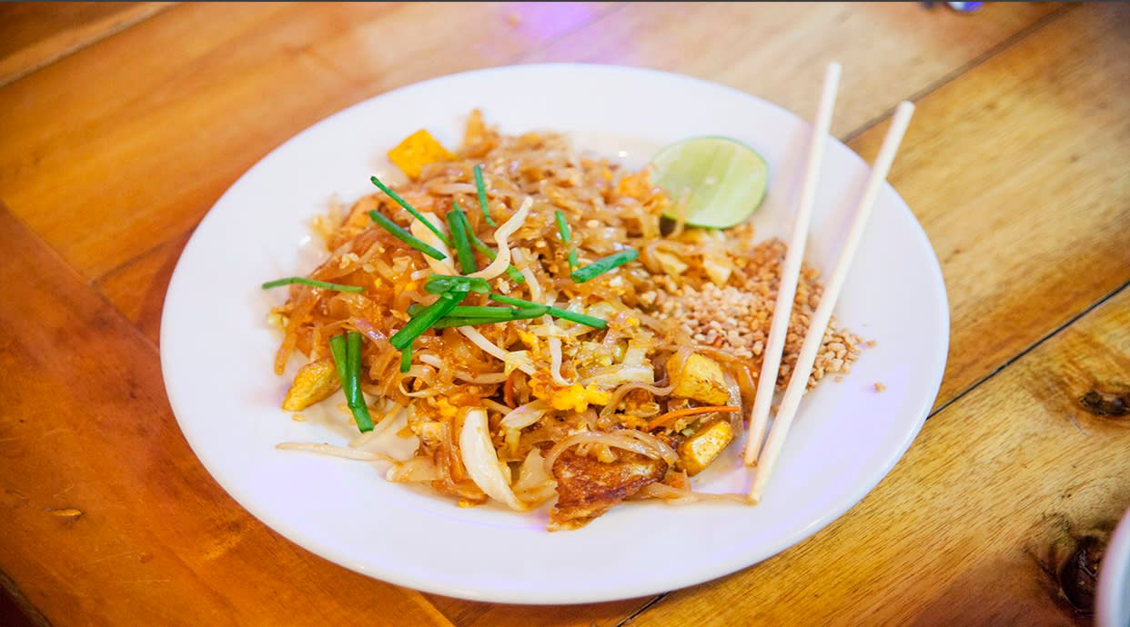 Tallarines de arroz cocidos al dente, mezclado con varios vegetales (pimiento, cebolla, zanahoria, brócoli) y gambas frescas