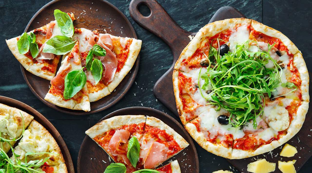 Base de tomate y mozzarella, jamón York, bacón, parmesano, albahaca fresca y aceite de oliva