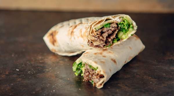 Pan de lebanos, ternera, lechuga, tomate, cebolla y salsas
