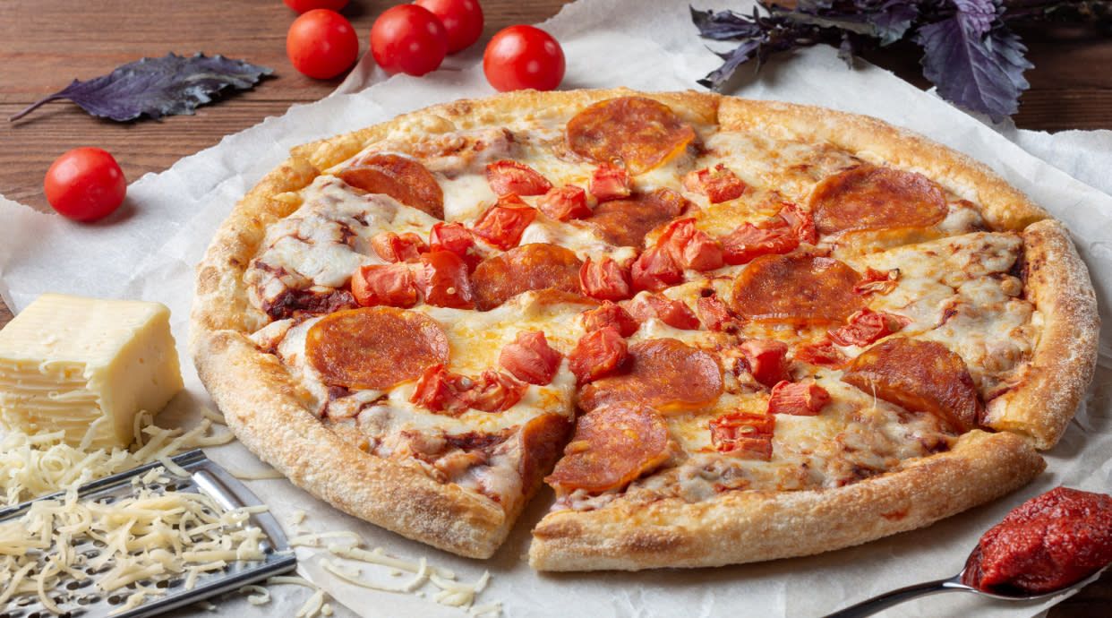 Tomate natural, mozzarella, jamón jork, salami, champiñones y aceitunas negras