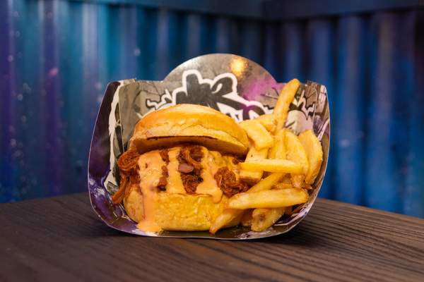 Brioche, salchicha, cheddar fundido, cebolla frita y patatas paja