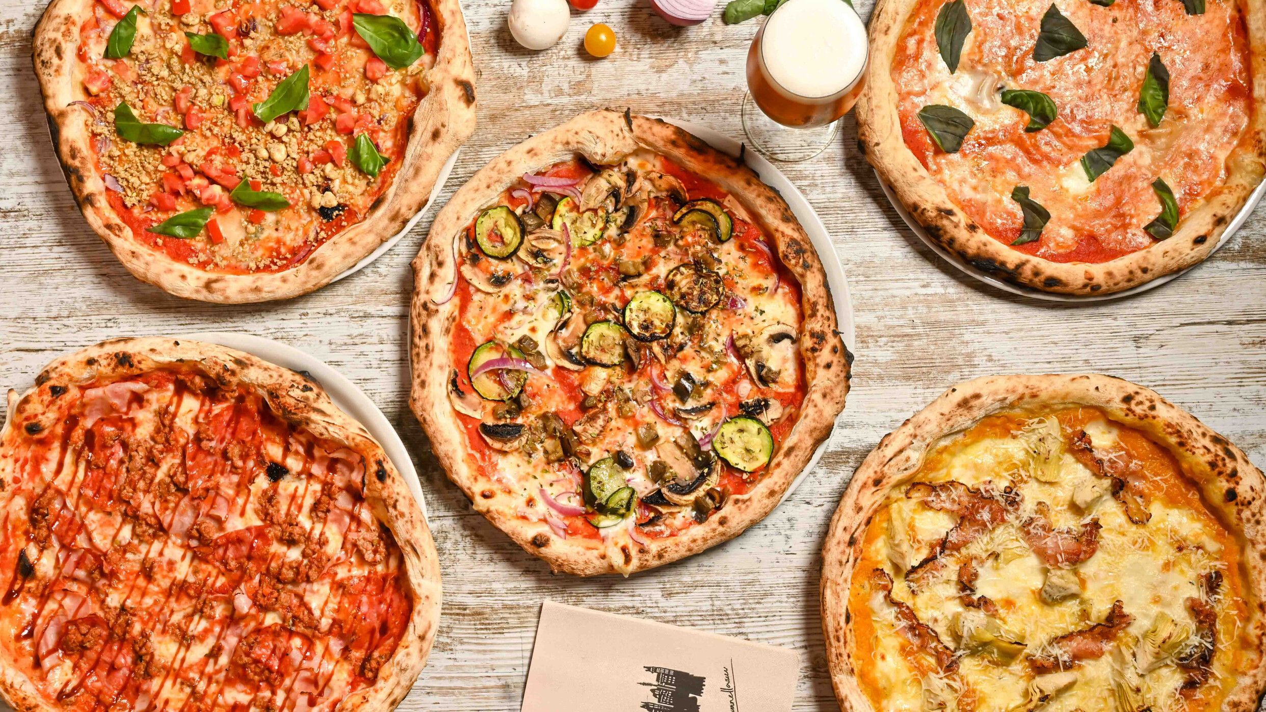 Mozzarella, tomàquet, mozzarella de búfala, ceps, gorgonzola, salsitxa, tomàquet cherry