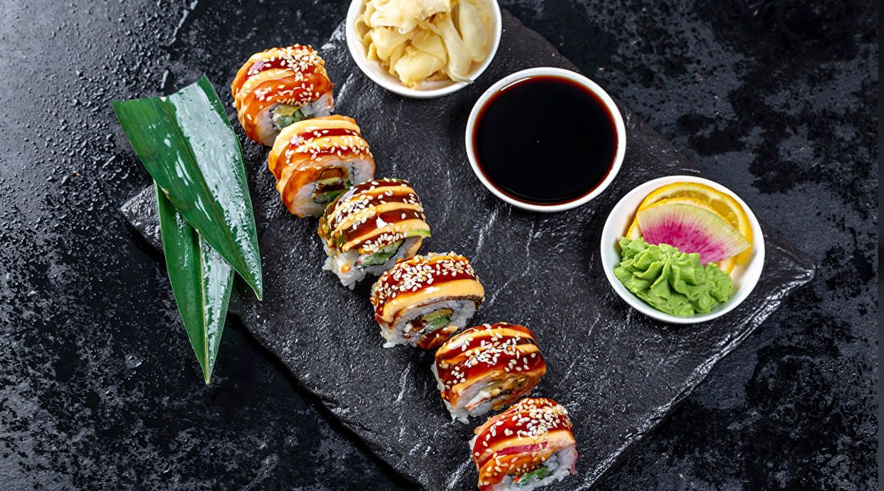 Amb tempura de llagostins i ous de peix volador cobert de salmó flambejat caramel·litzat i salsa japonesa 8p