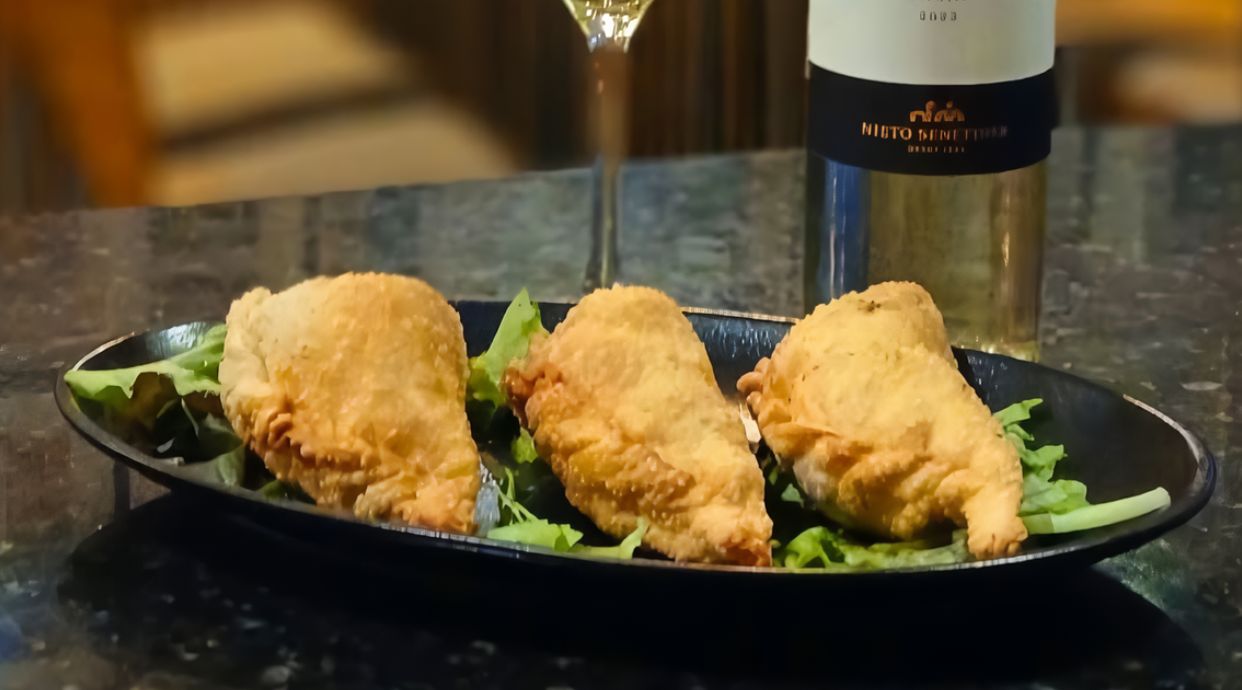 La quintaesencial empanada argentina. Carne molida de ternera, cebolla, pimiento rojo y aceitunas verdes.