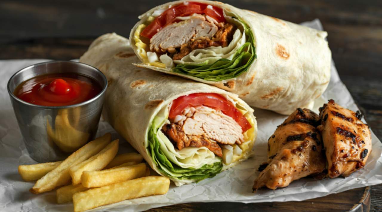 La carne de kebab (pollo, ternera o mixta) se envuelve en una tortilla fina y grande, similar a un wrap