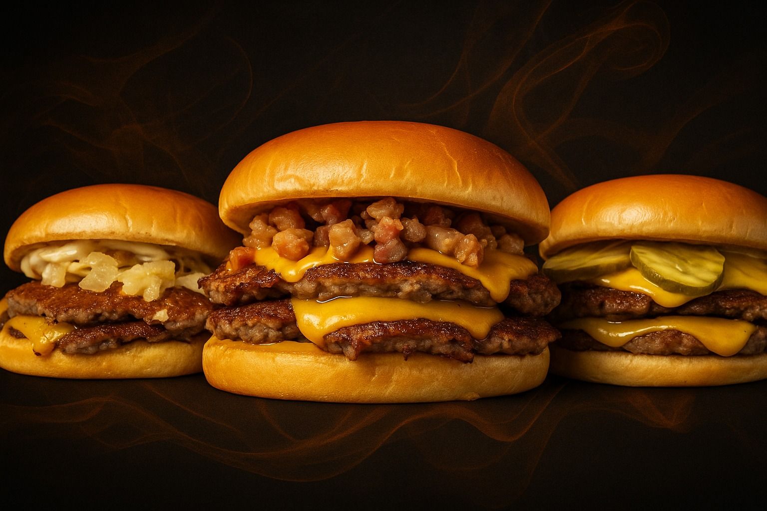 Brioche Potato Rolls by Juanito Baker, 100% Angus Smash Burger, Smokey Cheddar, Spiced Onion, Crunchy Pickles Y Salsa Queen Con Un Toque Dulce