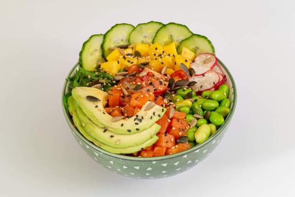 Arroz, salmón, soja, wakame, edamame, rabanillos, pepino, mango, cherry. aguacate, sésamo de dos colores, mix de pipas y tu salsa favorita