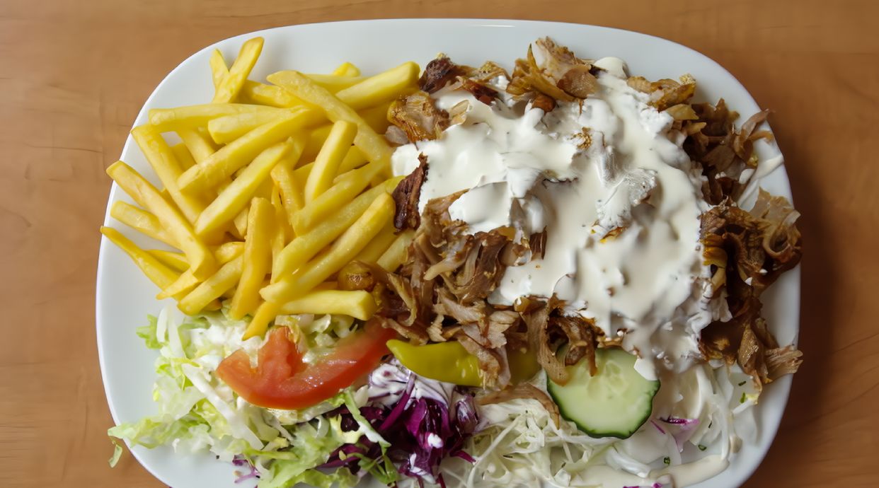 Doner kebab con ensaladas frescas, pan tostado, salsa de yogurt y kétchup