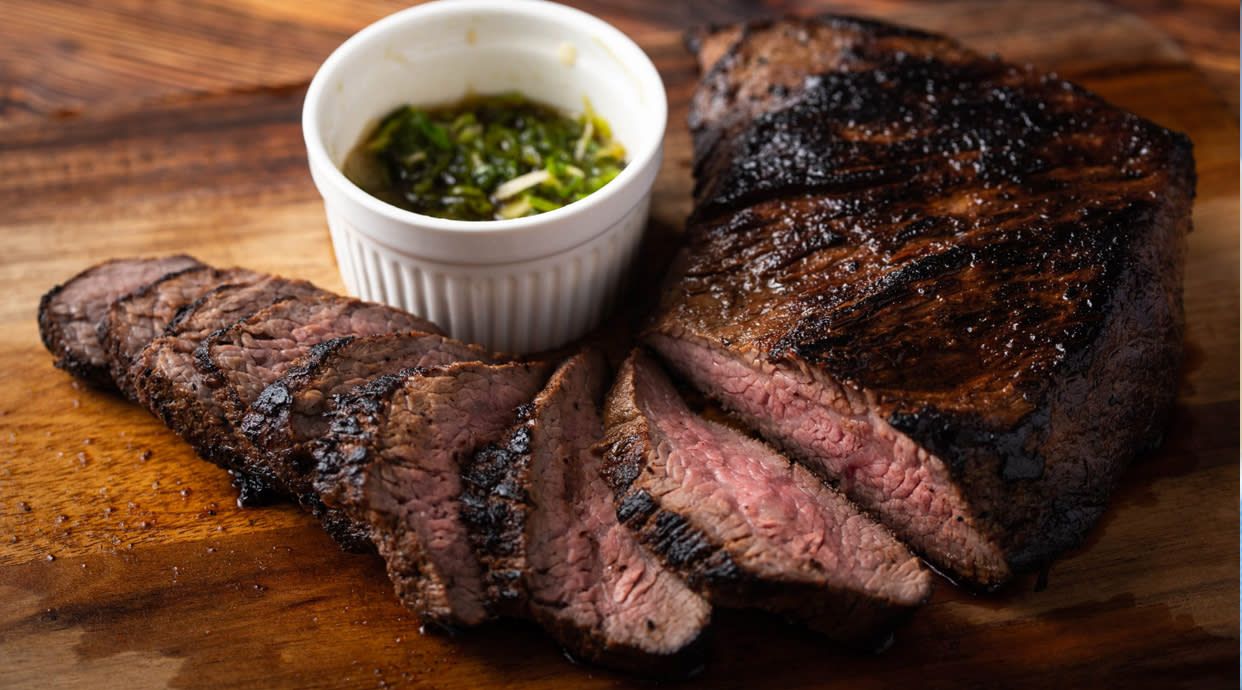 Buey a la parrilla (200 g.), lechuga, queso cabra, mermelada de tomate y cebolla caramelizada, acompañadas con patatas.
