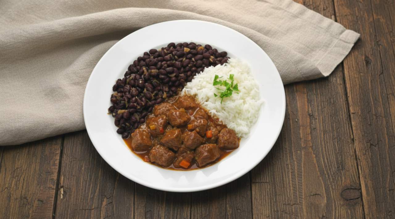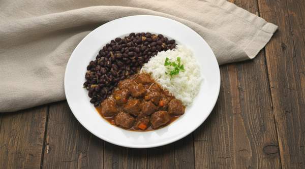 Plato principal de arroz, acompañado de habichuelas (frijoles) y carne de ternera guisada