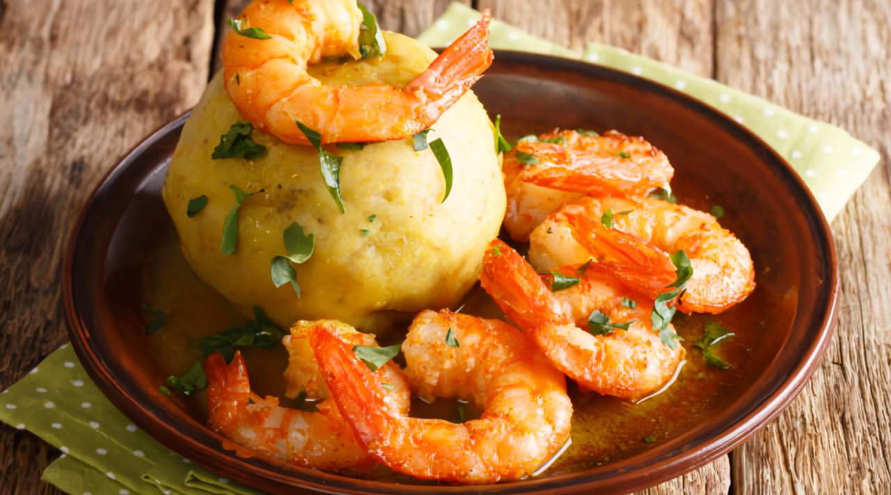 Mofongo de plátano con crema de queso y gambas