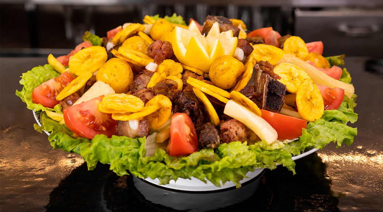 Pollo y cerdo frito con platanos verdes fritos Puedes elegir si lo quieres acompañar con platanos verdes Prúebalo y nos das tu opinión