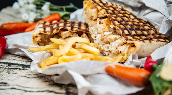 Pollo, queso, lechuga, cebolla, tomate, maíz, remolacha, zanahoria, olivas, patatas fritas, salsa atlas de la casa, salsa algerian, ketchup y mayonesa