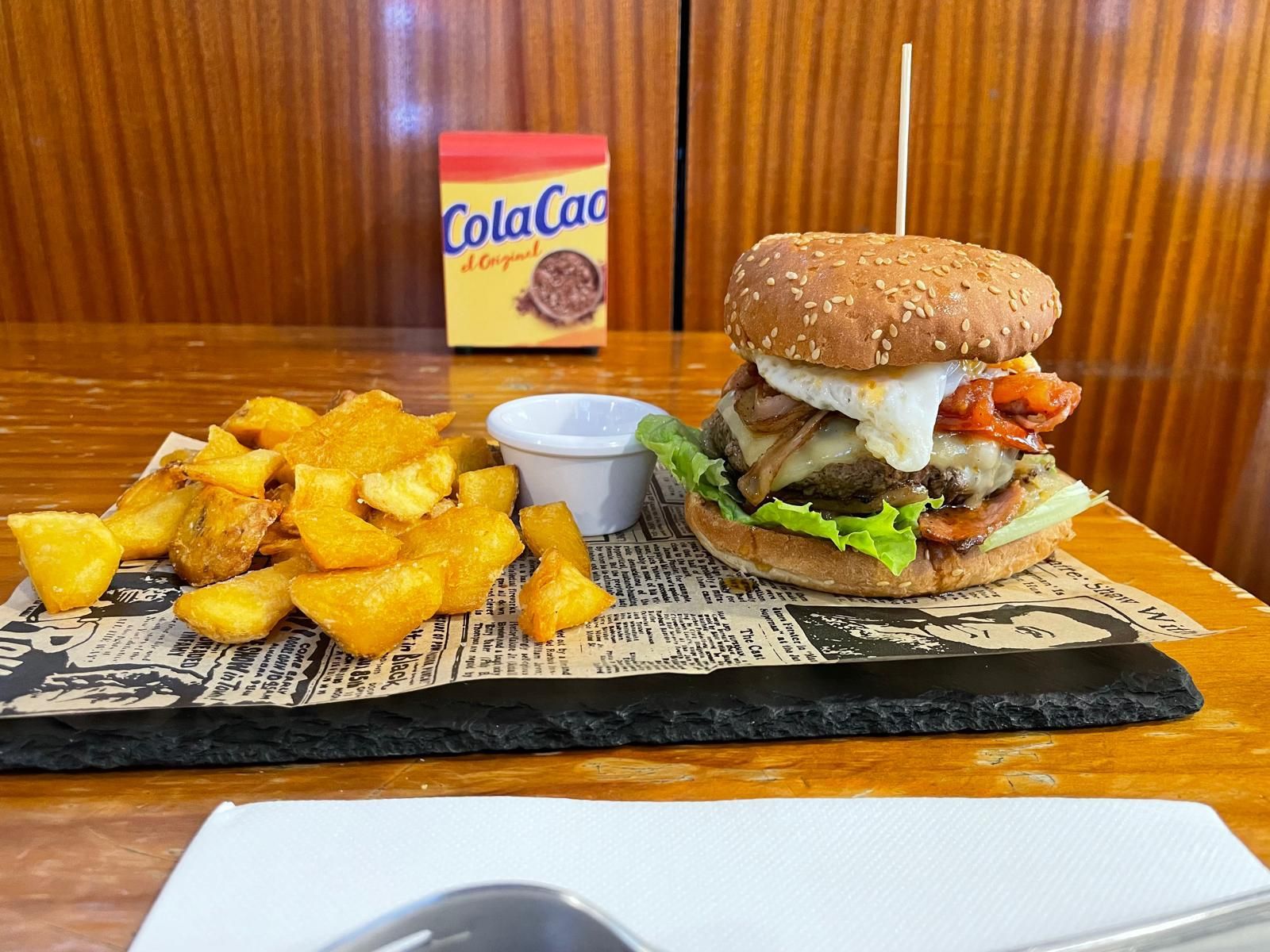 Salsa de la casa, carne (160 g.), bacon, huevo frito, tomate y cebolla asada