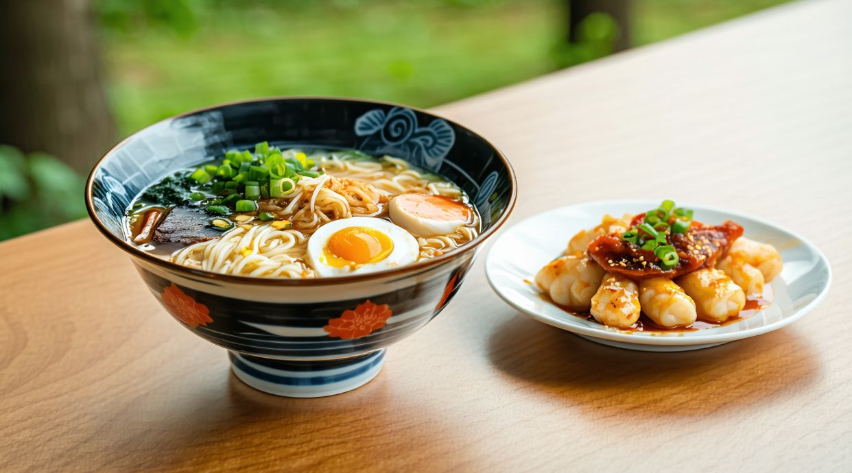 Fideos, pato frito, bambú, pak choi, naruto, cebollino, huevo, brotes de soja, col china, tiras de puerro y nori