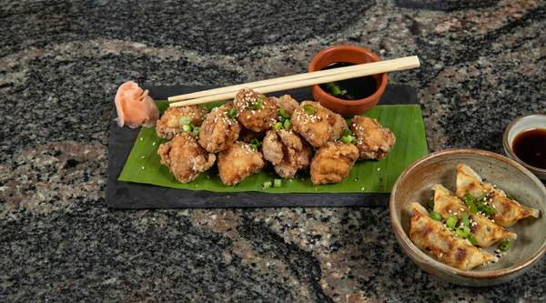 Crujiente de pollo frito japonés trozos de pollo marinado, empanizados ligeramente y fritos hasta quedar