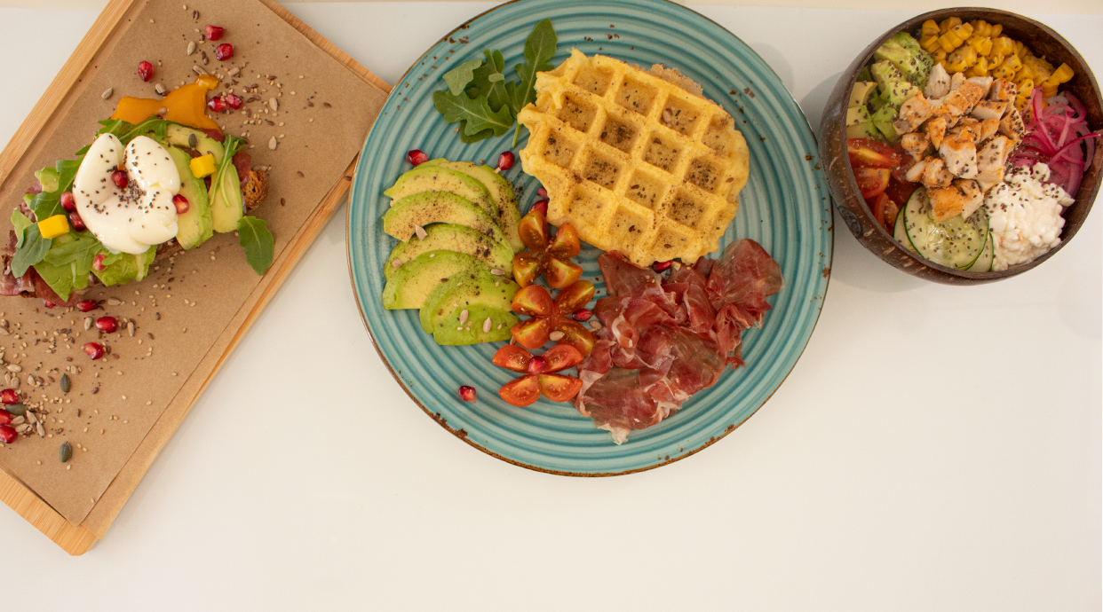 Tostada con aguacate, jamón ibérico Montesierra, huevos poché y rúcula y 1 bowl exótico de yogur griego con base de frutas, cereales de chocolate sin azúcar y semillas