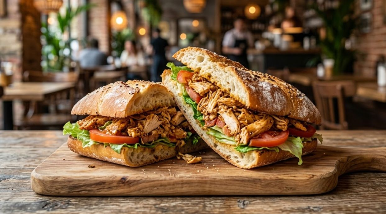 Pechuga de pollo, queso, mayonesa, lechuga, tomate y cebolla.