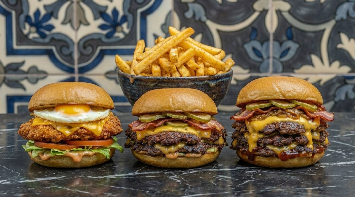 Doble carne smash de ternera, queso gouda, cheddar, huevo frito, doble bacon y salsa BBQ. Bañada en cheddar y topping de serrano crispy. Acompañado de patatas fritas