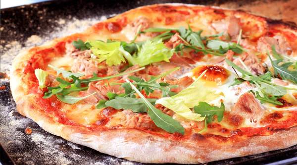 Tomate, mozzarella, jamón cocido, atún, salami y champiñones
