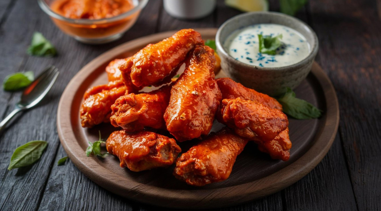10 piezas Alitas de pollo picante servidas con salsa de queso azul.