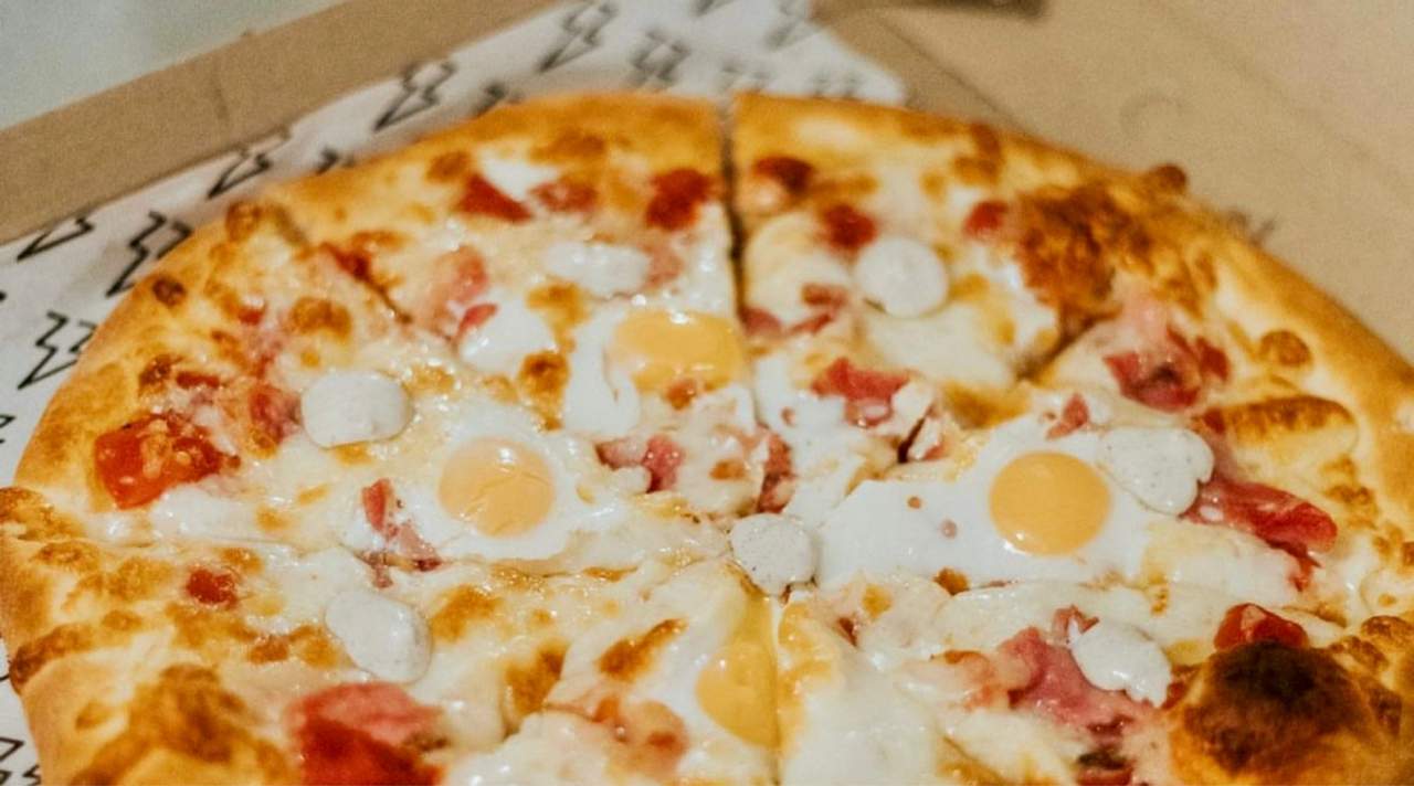 Pizza: Tomate, mozzarella, bacón, huevos de codorniz y salsa de trufa