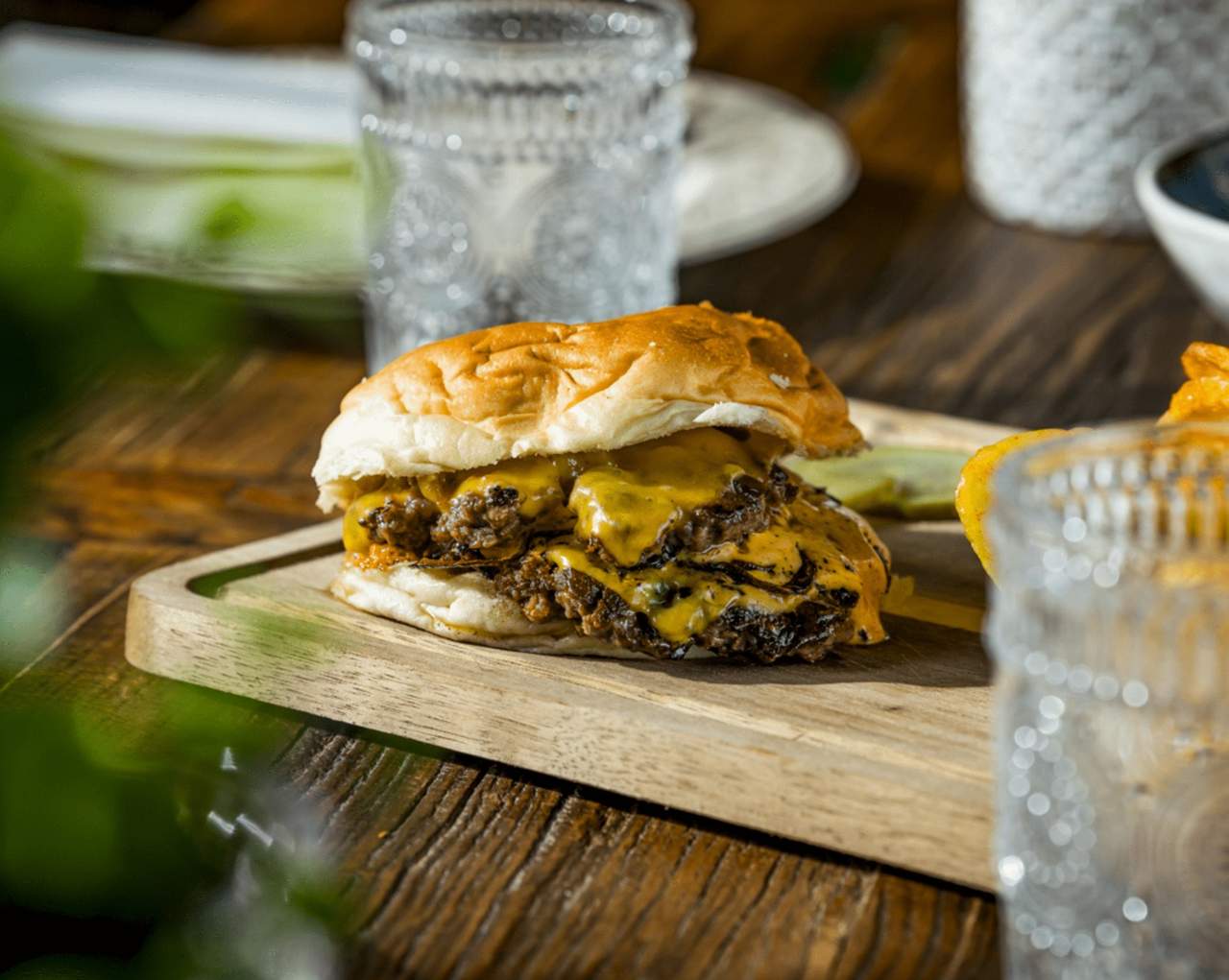 Smash burger de cecina de León con queso de cabra, cebolla caramelizada, mermelada de pimientos y rúcula