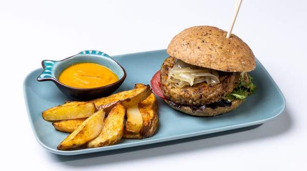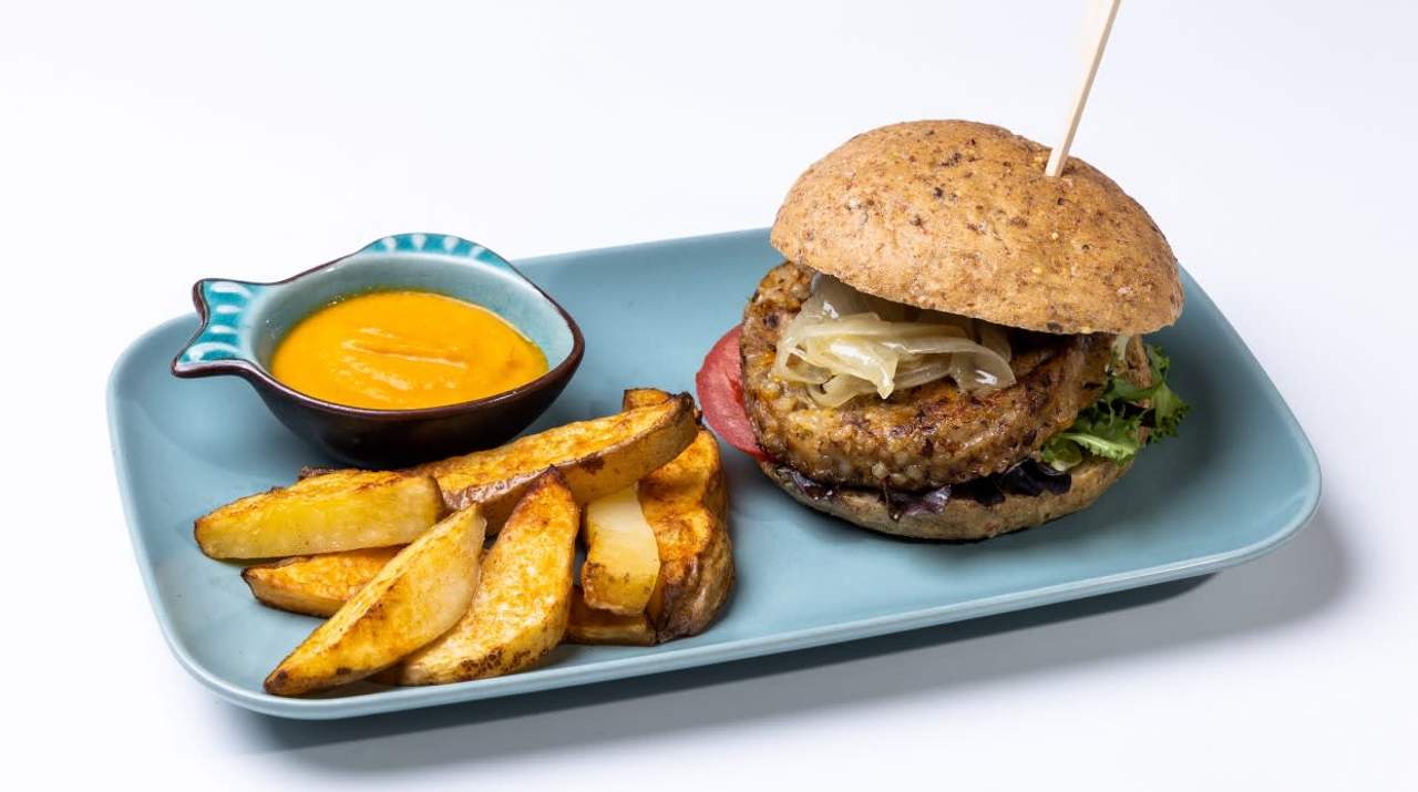 Hamburguesa beyond burger con cebolla pochada, ensalada y salsa de verduras. Acompañada con patatas