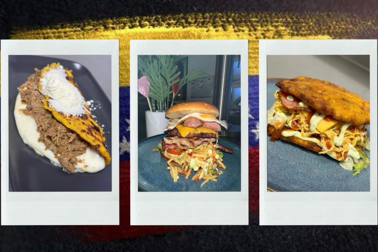 platano amarillo, queso de mano, carne de hamburguesa, salsas, y patatas chips
