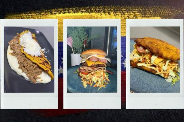 Platano verde, vegetales, carne mechada, queso, bacon y salsas