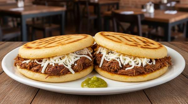 Arepa artesanal con carne desmechada y queso fundido