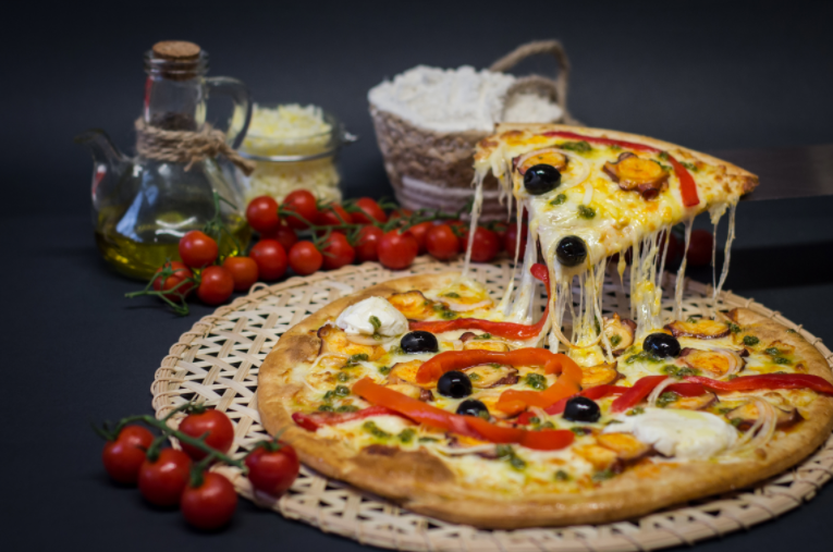 Pizza base, tomate, mozzarella, pollo o carne picada, pimientos, cebolla, bacon