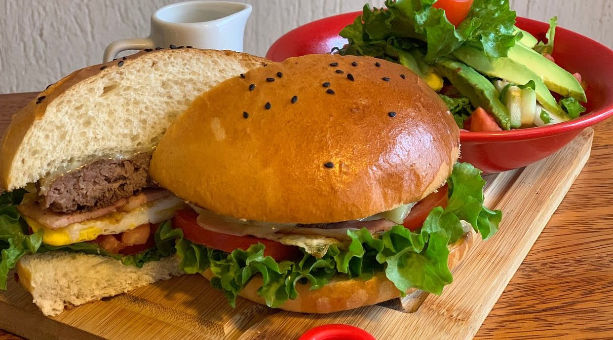 Saborea una hamburguesa de carne casera en pan de brioche, con queso derretido, lechuga crujiente, tomate fresco, beicon, cebolla, pepinillo, pimiento del piquillo, jamón y huevo. ¡Una delicia que no querrás dejar de probar!