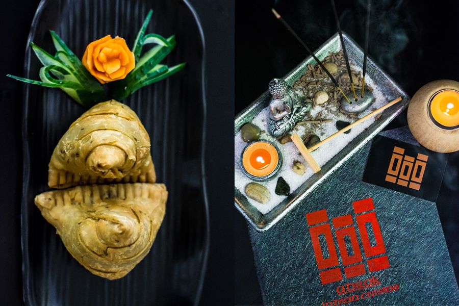Envoltura de masa de harina de trigo fina y crujiente rellenas de patatas y guisantes